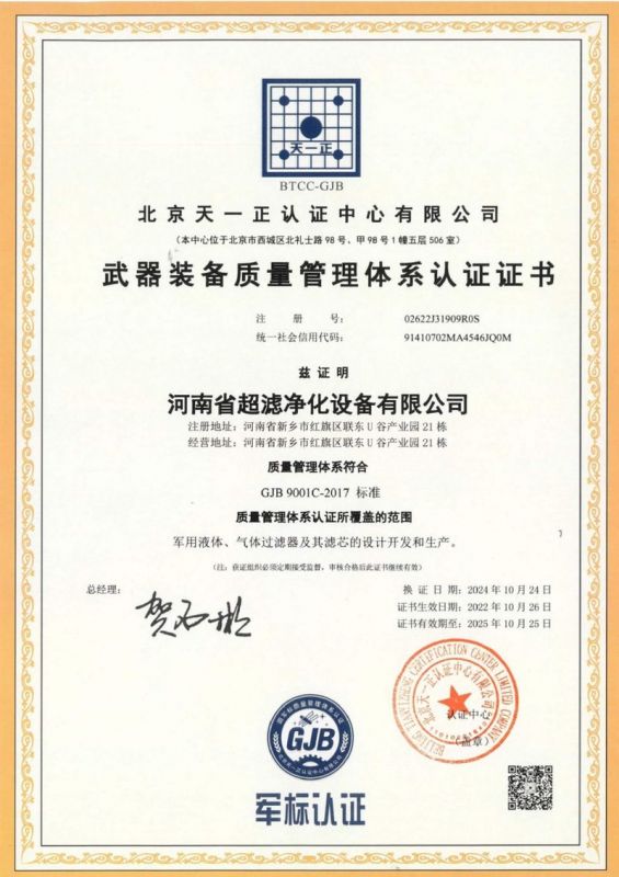 河南省千亿qy88国际官网入口净化设备有限公司成立于2018年,座落于河南省新乡市,是一家集滤芯、过滤器、成套过滤装置及液压附件、液压泵、特种阀等产品的研发、生产、销售、技术服务为一体的综合性企业。主要服务于国内的航空、航天、船舶、核工业、煤碳、石油化工、电力、工程机械等行业。公司拥有2项发明专 利(ZL  2024 1 0110610.0 、ZL 20243 1 1806105.1)和6项实用新型专 利(ZL  202220053751.X、ZL202222784245.0、ZL202222578329.9、ZL202222630720.9、ZL202222864294.5、ZL202222712176.2),研发人员的不懈努力,锐意进取,加上经验丰富的技工与生产设备的结合,更好的产品技术使得质量有了更可靠的保障,保证了产品的及时交付,增强了企业的核心竞争能力。公司是过滤与分离行业协会会员单位,秉承“以质量求生存,靠创新谋发展”的指导思想,始终把产品质量放在前位,不断进取,持续改进,精益求精,按照ISO9001标准建立了一套完善的质量保证管理体系,2022年通过了国 军标《GJB9001C-2017》质量体系认证,使公司的产品质量得到提升,也将规范公司的管理,为客户提供更多的、稳定的高品质产品。2023年,公司获得了高新 技术企业荣誉称号。2024年,获批成立新乡市航天精密流体元件技术工程研究中心。